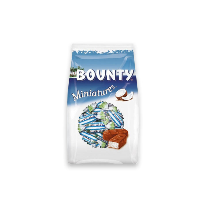 - **الوصف:** قطع صغيرة من شوكولاتة باونتي الشهيرة، تحتوي على مركز من جوز الهند الطري والحلو، مغلف بطبقة ناعمة من شوكولاتة الحليب. تمنحك نكهة استوائية مميزة في كل قطعة، مثالية للمشاركة أو التذوق الفردي.