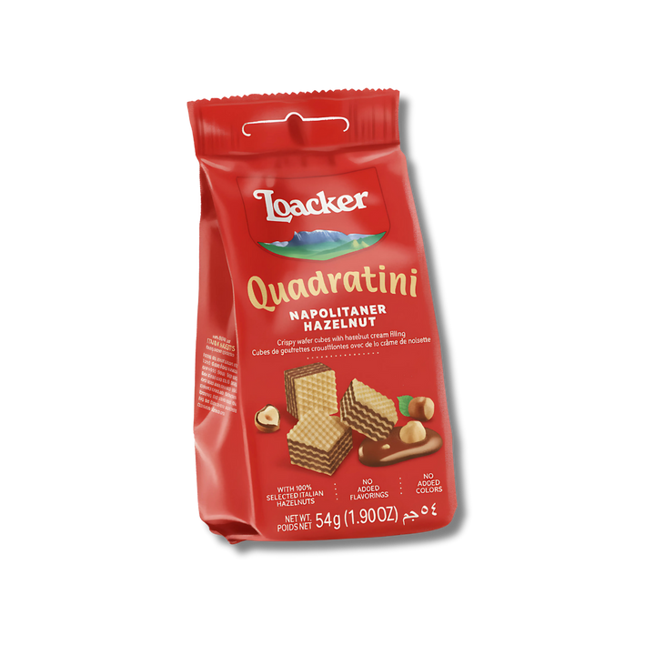 **الاسم والوزن:** ويفر لوكر كوادراتيني نابوليتانر بالبندق – عبوة واحدة × 54 جرام